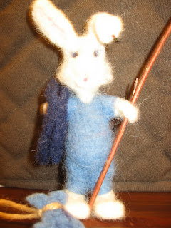 Aluksi huovutin vain perinteisesti saippuan kanssa roiskimalla. Neljä vuotta sitten mieheni toi minulle huovutusneuloja ja pyysi tekemään jotain kivaa. Minä tottelin ja yritin. Ensimmäinen neulahuovutustyöni on tämä kalasteleva Jupukka.(Hänellä on tietysti Suomen lain mukaiset pelastusliivit, eihän sitä muuten vesille.) Rungoksi laitoin rautalankaa ja sitten vain kokeilin.
